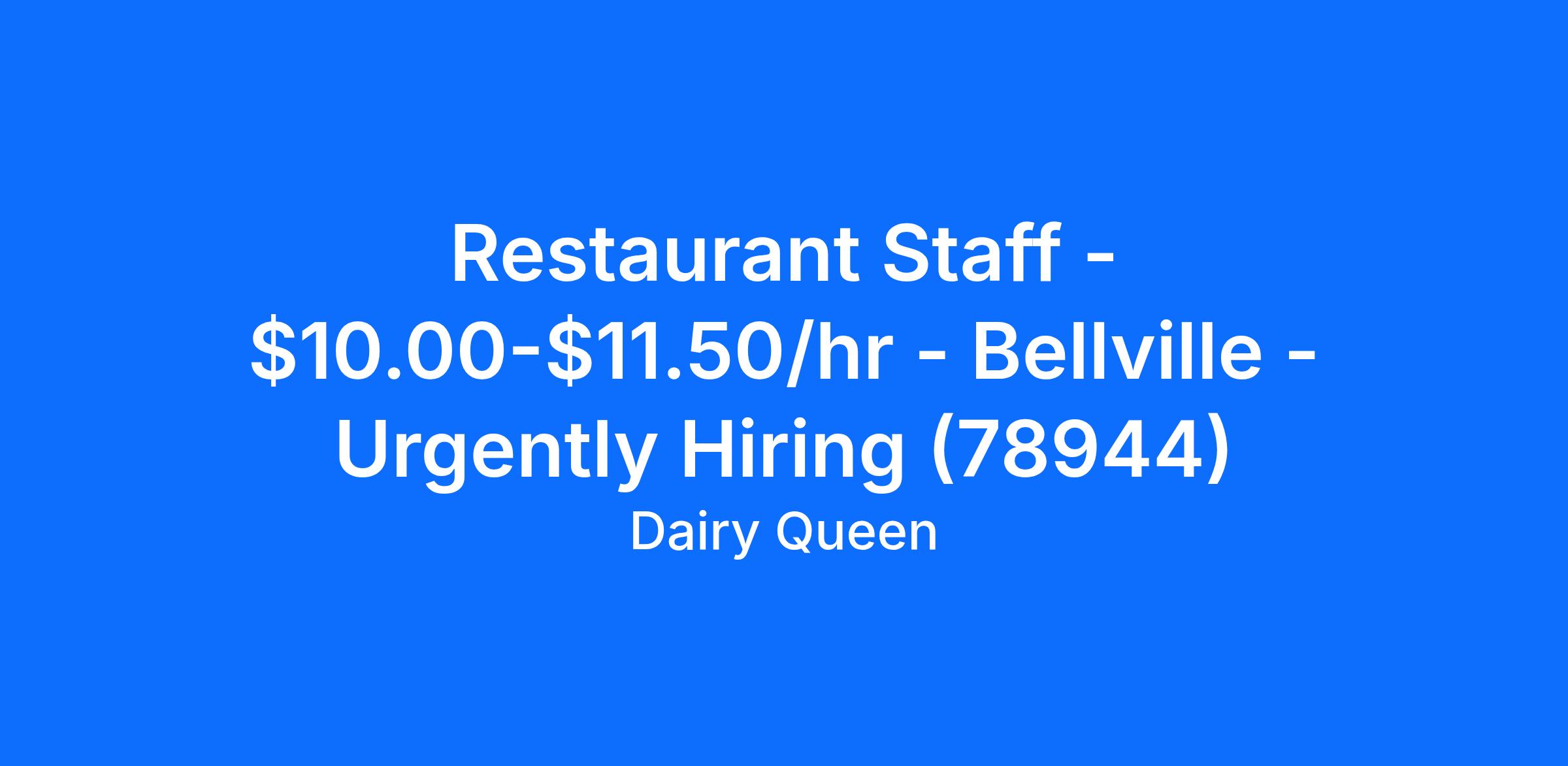 Dairy Queen - Bellville is looking for a full time or part time Restaurant Staff team member to join our team in Bellville, TX. The Restaurant Staff team member is responsible for customer service and commitment to excellence through meeting or exceeding hospitality and service standards.