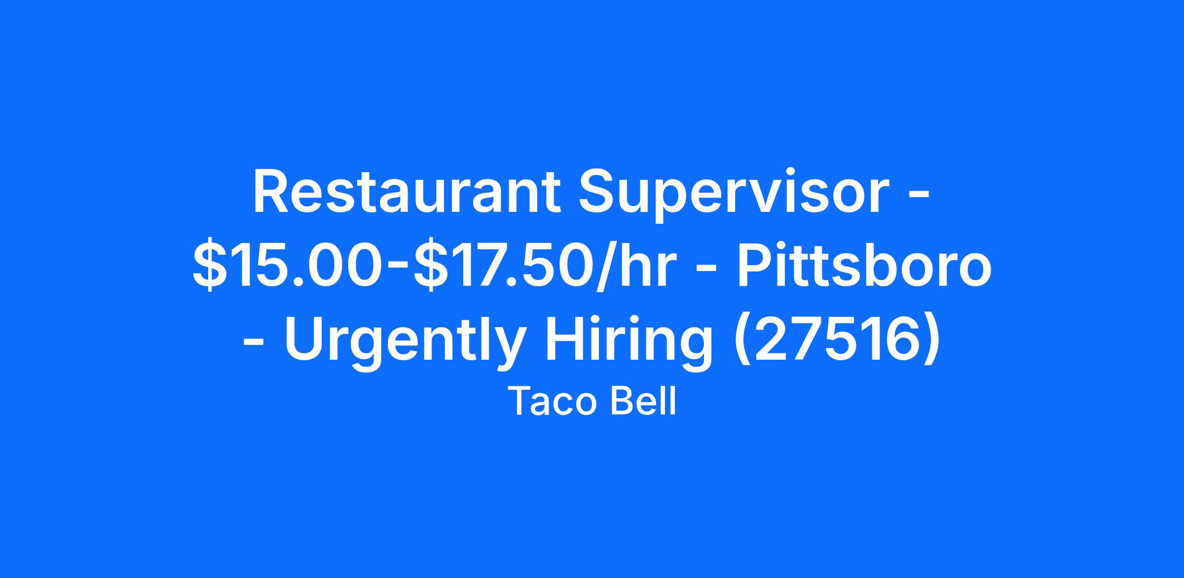 Restaurant Supervisor - $15.00-$17.50/hr - Pittsboro - Urgently Hiring (27516)