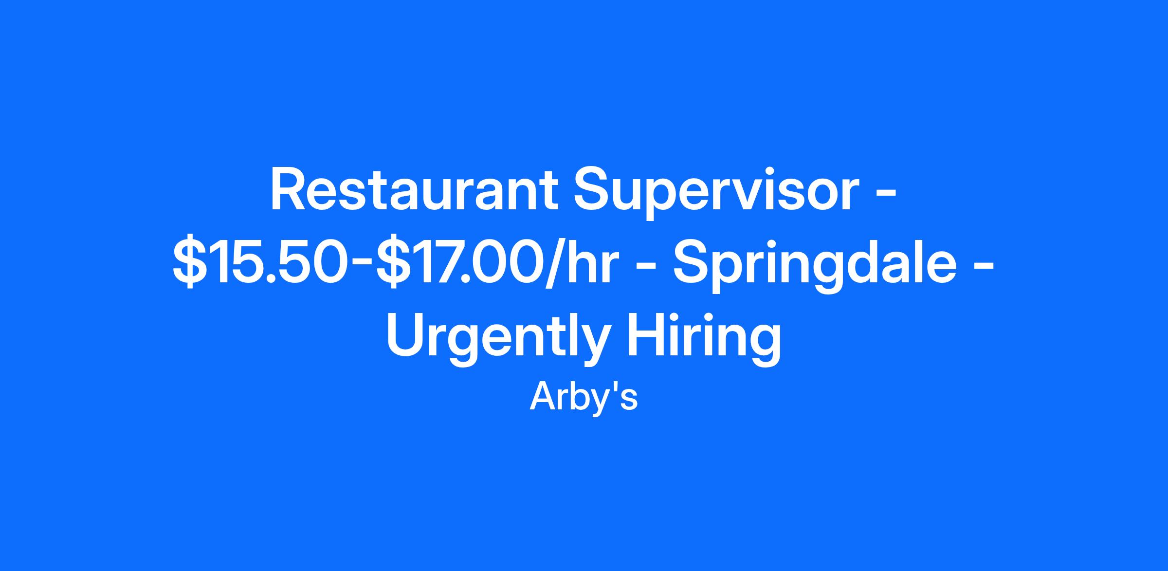 Arby's - Springdale is currently hiring a full time or part time Restaurant Supervisor for our Springdale, AR location. A Restaurant Supervisor should not only supervise their team but lead it to acheive their goals. A Restaurant Supervisor will assist in the planning and management at Arby's - Springdale in order to achieve customer satisfaction, quality service, compliance with store policies all while meeting and/or exceeding financial goals. Applicants for this role should have effective verbal and written communication skills.