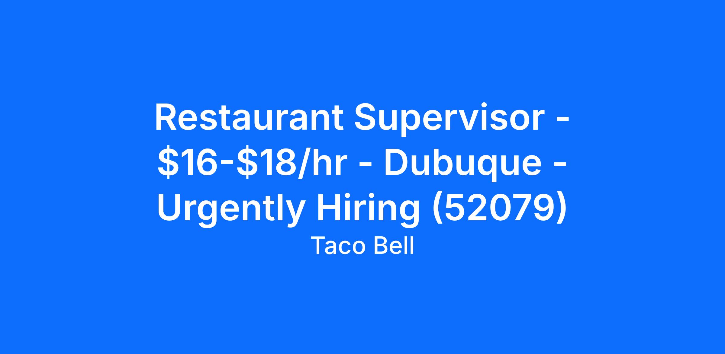 Taco Bell - JFK is currently hiring a full time or part time Restaurant Supervisor for our Dubuque, IA location. A Restaurant Supervisor should not only supervise their team but lead it to acheive their goals. A Restaurant Supervisor will assist in the planning and management at Taco Bell - JFK in order to achieve customer satisfaction, quality service, compliance with store policies all while meeting and/or exceeding financial goals. Applicants for this role should have effective verbal and written communication skills.
