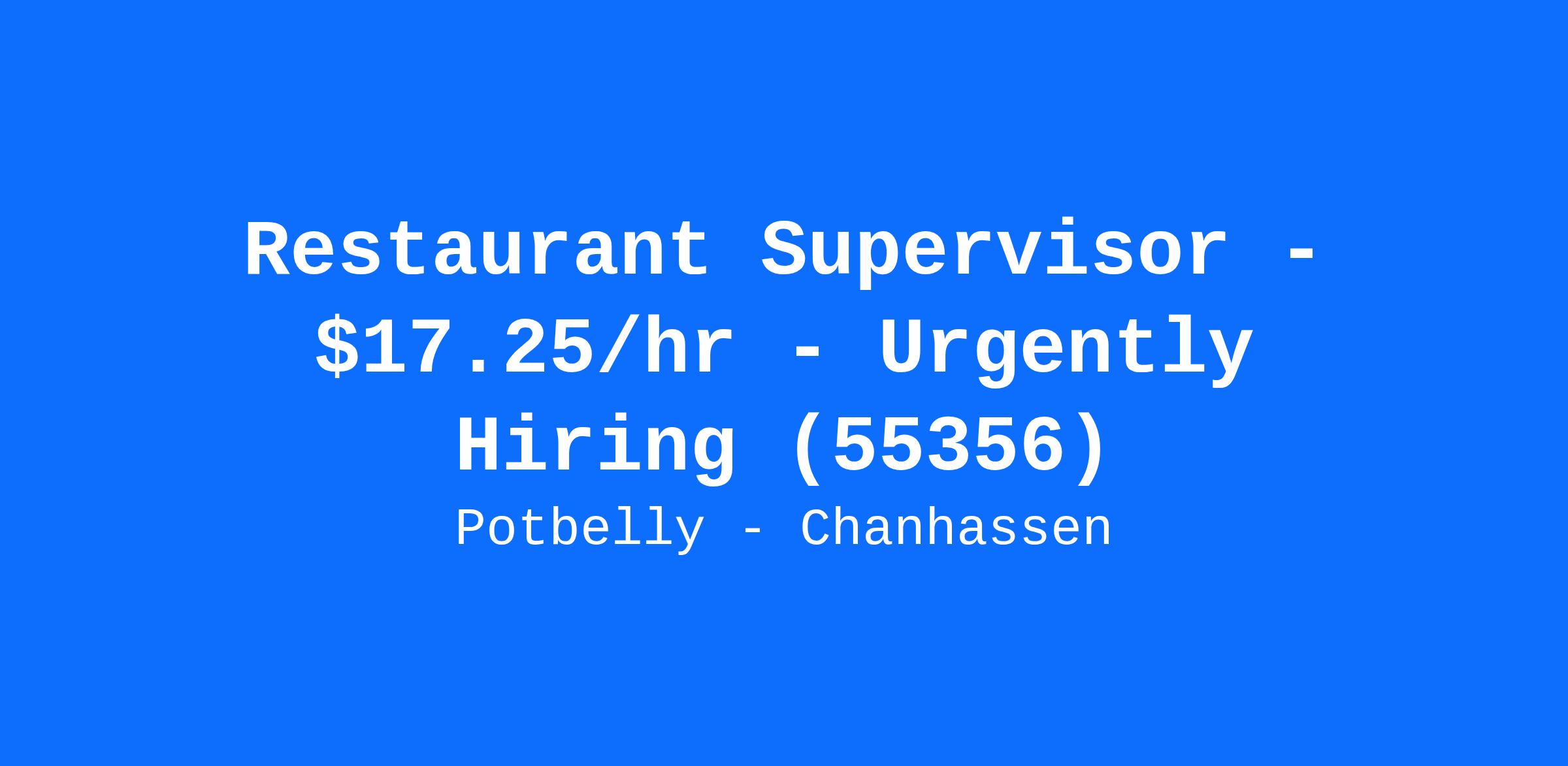 Potbelly - Chanhassen is currently hiring a full time or part time Restaurant Supervisor for our Chanhassen, MN location. A Restaurant Supervisor should not only supervise their team but lead it to acheive their goals. A Restaurant Supervisor will assist in the planning and management at Potbelly - Chanhassen in order to achieve customer satisfaction, quality service, compliance with store policies all while meeting and/or exceeding financial goals. Applicants for this role should have effective verbal and written communication skills.